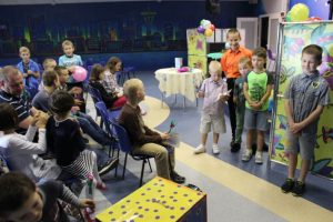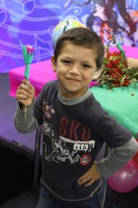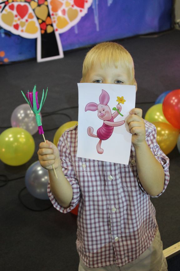 Приглашенные взрослые и дети, прибывшие пораньше, знакомились между собой. До начала самой программы детям была предоставлена возможность смастерить своими руками из бумаги и конфет «Сладкий цветочек». Кто-то еще старательно делает, а кто-то уже закончил и довольный присел на стульчик, ожидая начала программы.